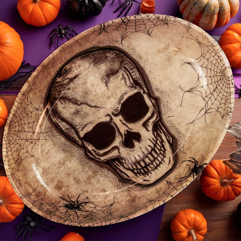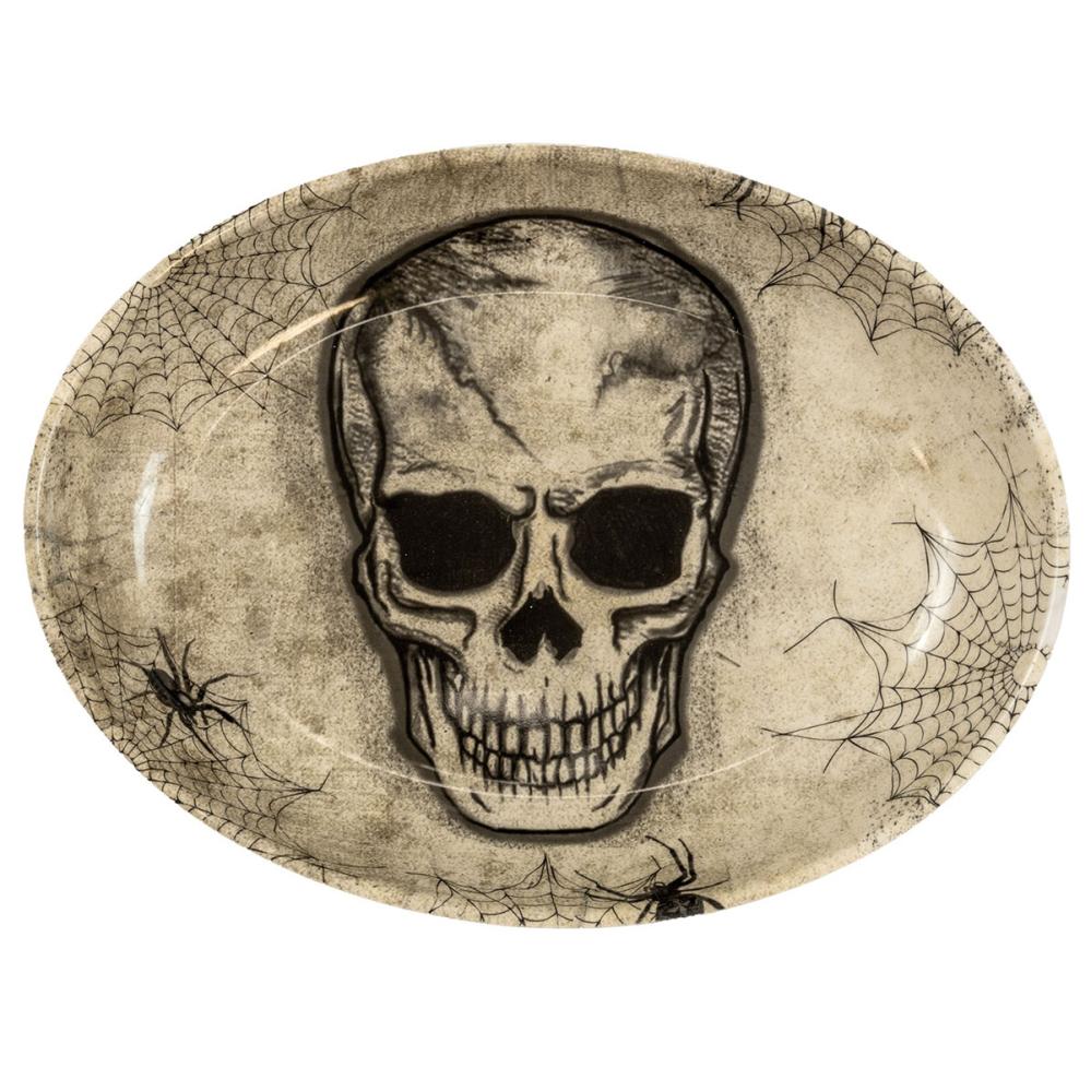 Tarjoilukulho Pääkallo on luunvalkoinen tarjoilukulho, koristeltu mustalla pääkallolla, mustilla hämähäkinverkoilla ja mustilla hämähäkeillä.
