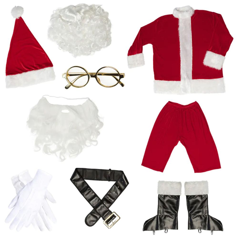 - Sisältö: Takki, housut, tonttulakki, saapassuojukset, vyö, silmälasit, parta, peruukki, hansikkaat