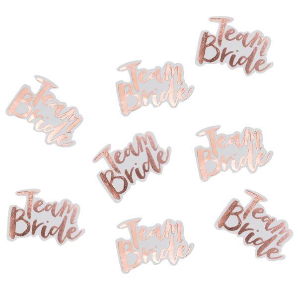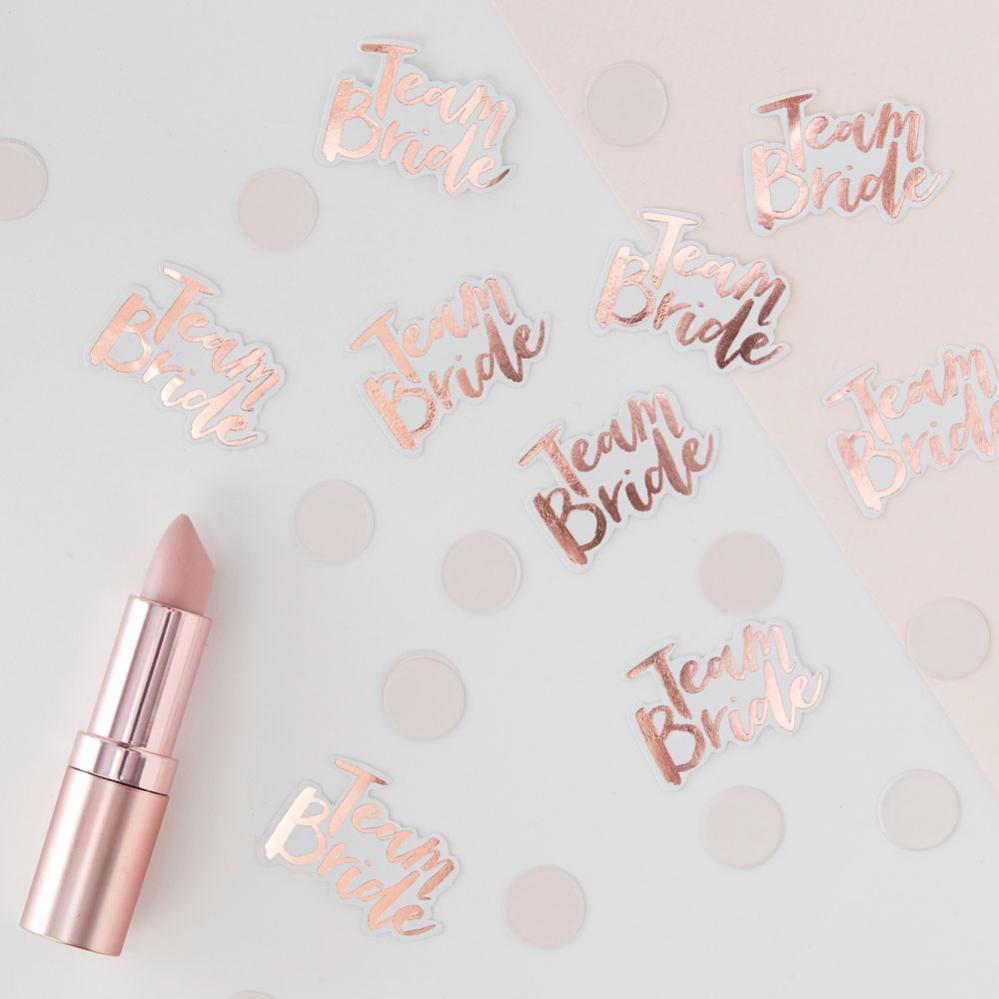 Team Bride Confetti sisältää konfettia tekstin muodossa "Team Bride" ruusukullan ja pastellin vaaleanpunaisissa ympyröissä.