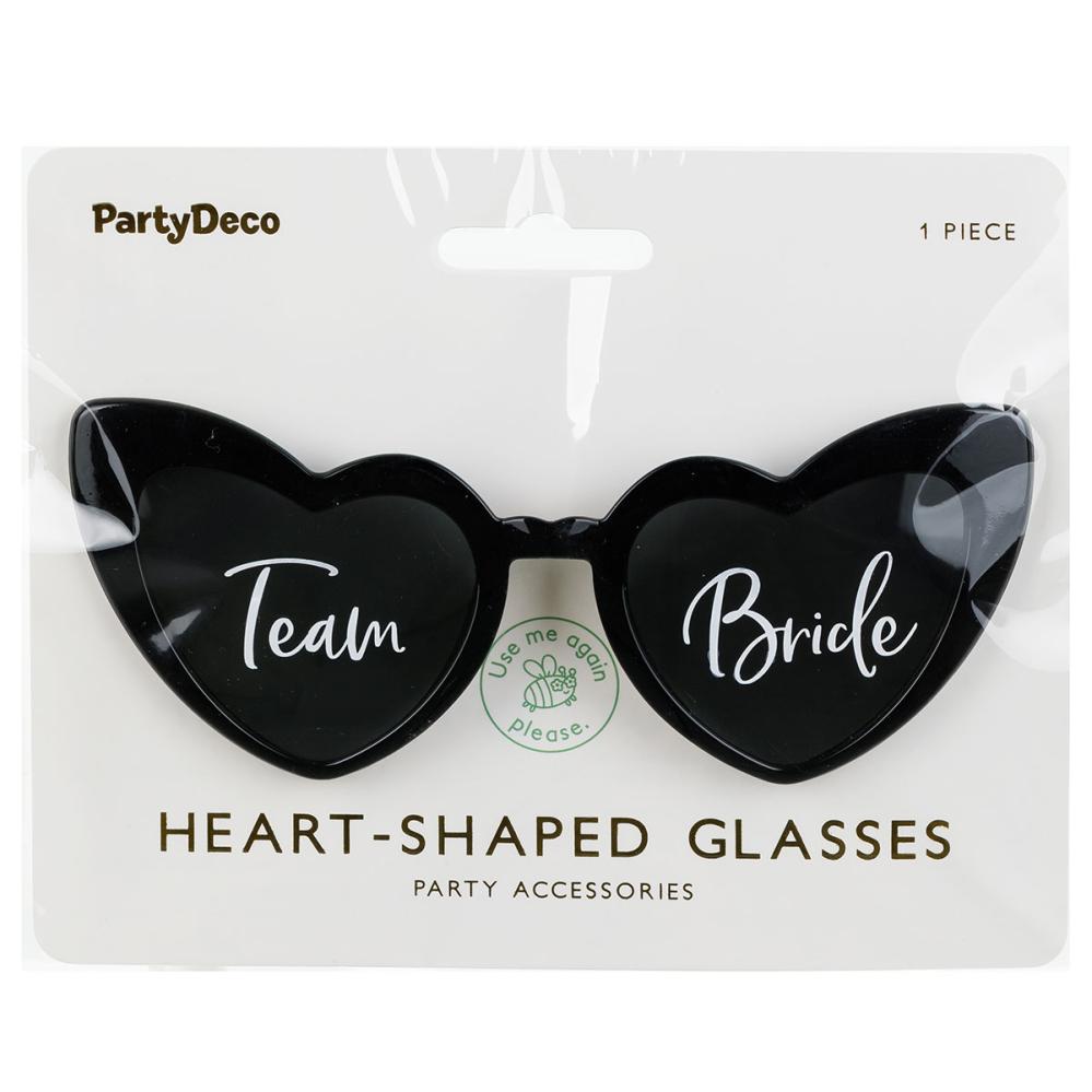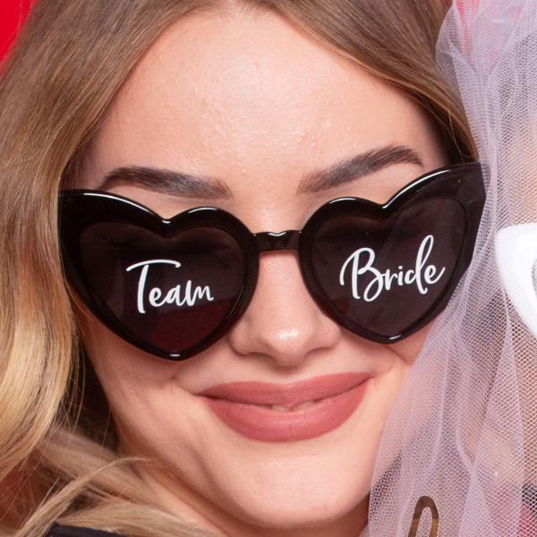 Team Bride Sydämenmuotoiset Silmälasit sisältää mustat, sydämenmuotoiset silmälasit tummennetuilla linsseillä sekä valkoiset tekstit 'Team' ja 'Bride' omilla linsseillään Huomioithan, että silmälasit eivät ole UV-suojatut!
