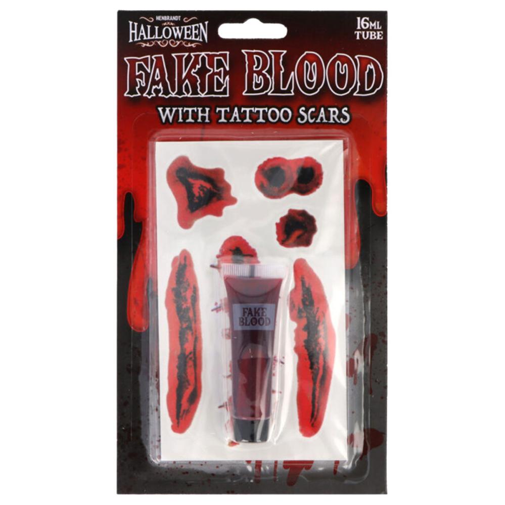 Tekoveri ja Haavatarra Setti sisältää kuusi kappaletta väliaikaisia naarmuhaavatatuointeja sekä yhden tuubin, jossa 16 ml punaista tekoverta.