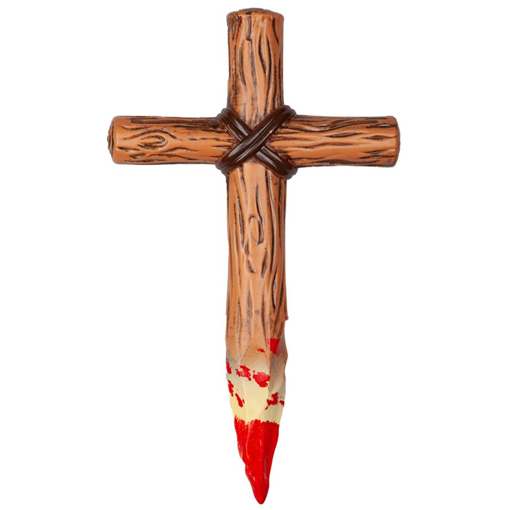 Terävä Vampyyriristi Verellä sisältää ristin, jonka terävässä päässä on verta. Risti on muotoilultaan ja väriltään sellainen, että se näyttää puumateriaalista tehdyltä.