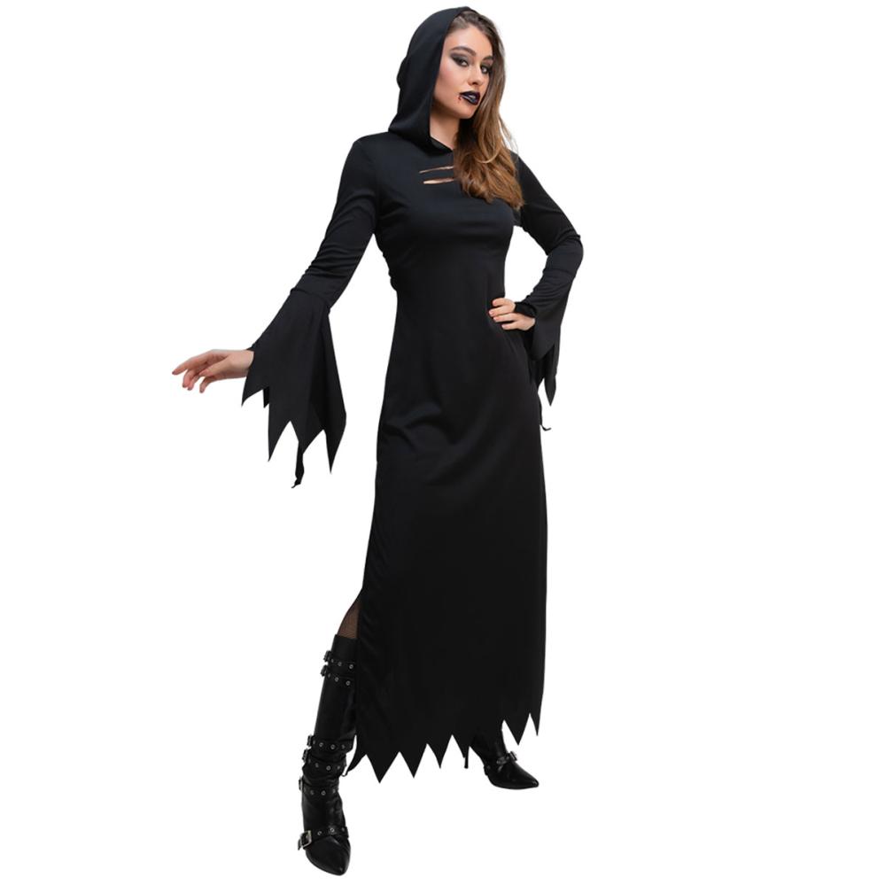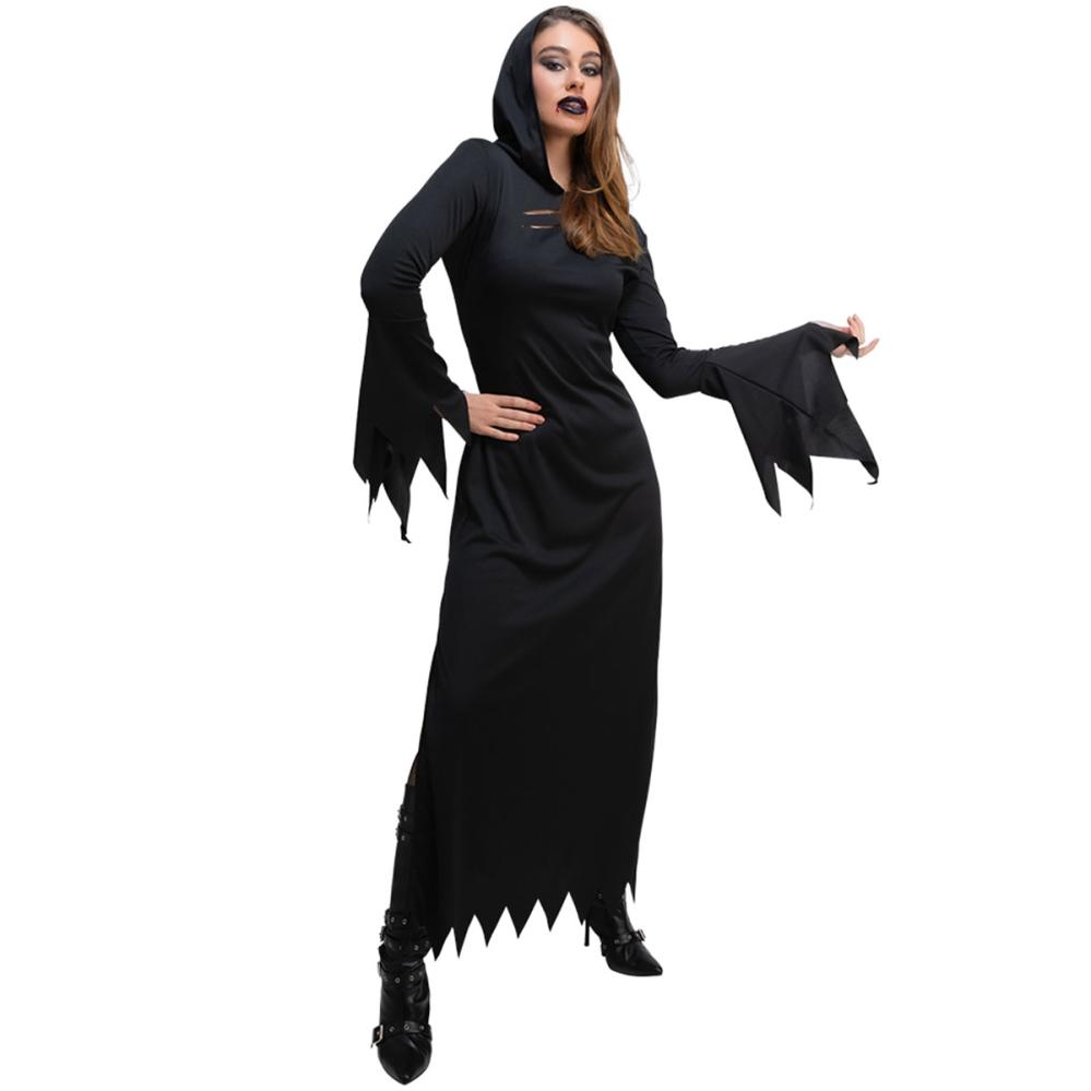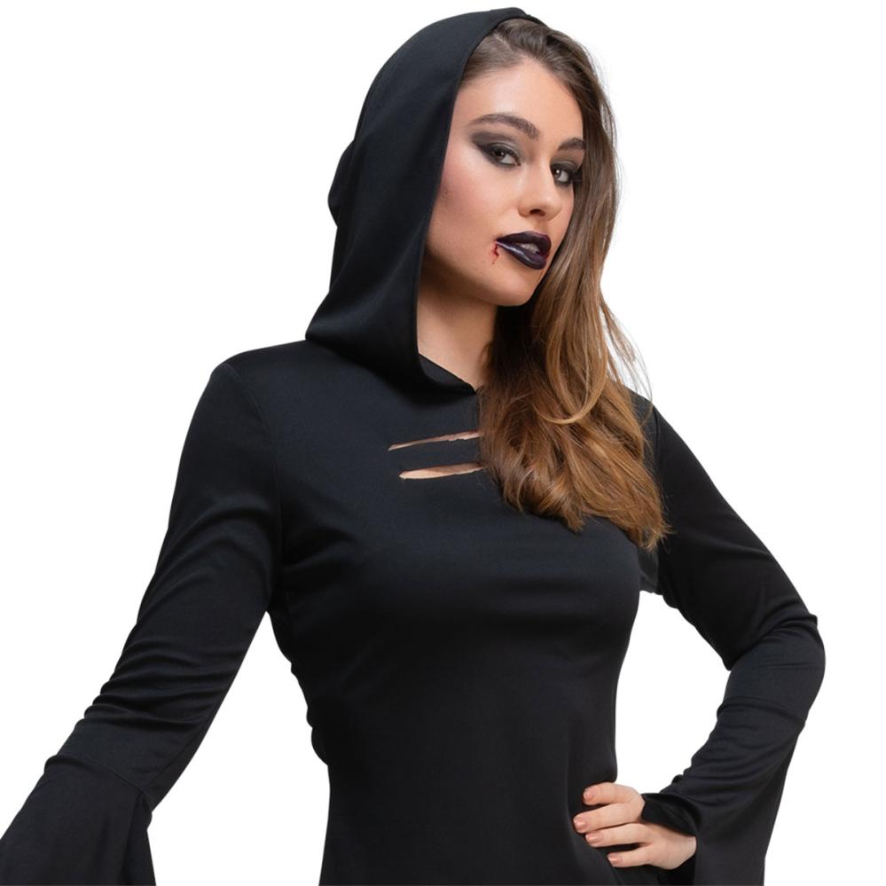 Teurastaja Mekko Musta sisältää pitkän mustan mekon levenevillä hihoilla ja sahalaitaisilla reunoilla.