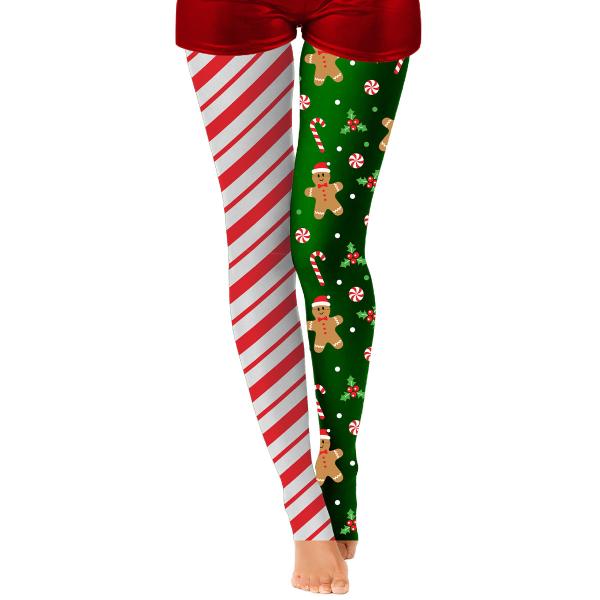 Tights Jouluaiheella on trikoot, joissa on erilailla kuvioidut lahkeet: toisessa lahkeessa on valkoisia ja punaisia polkagrisraitoja, toinen on vihreä polkagris-, orjanlaakeri-, lumiukko- ja lumihiutalemotiivein.