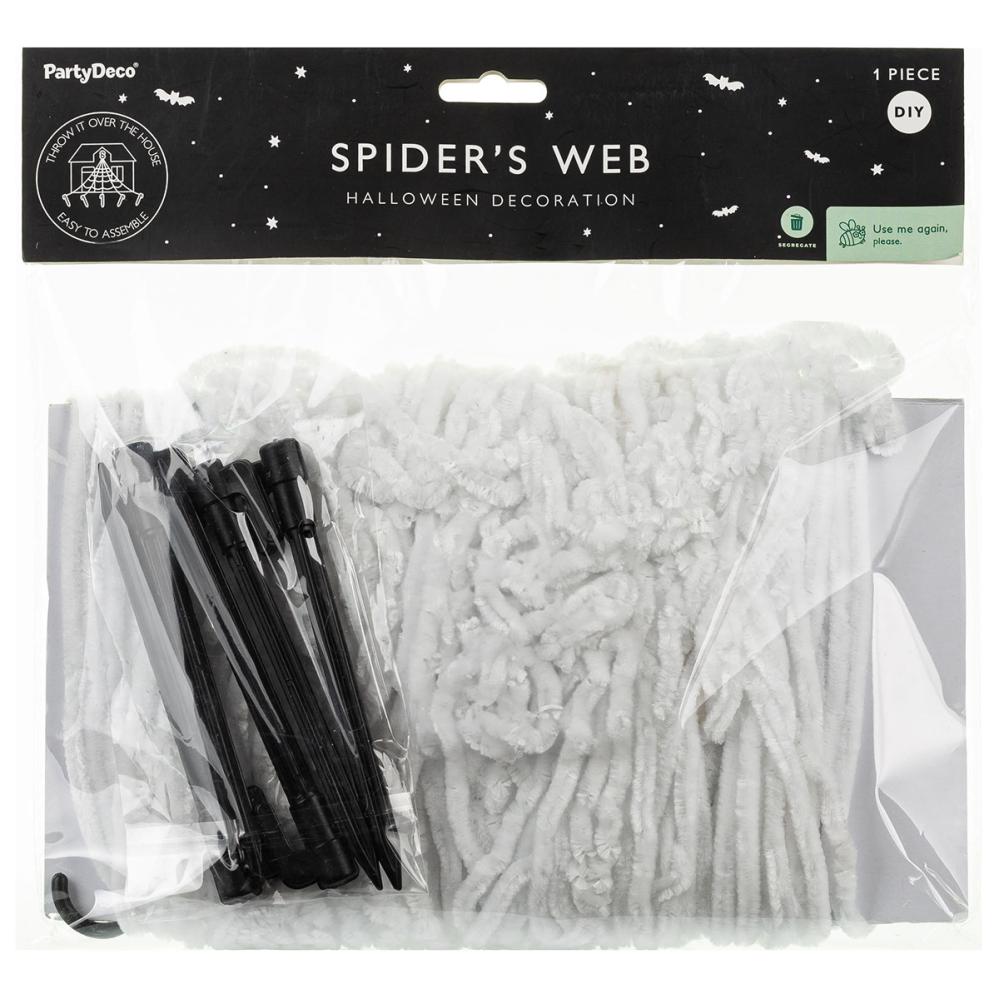 Ulkokäyttöinen Hämähäkinverkko Valkoinen sisältää realistisen valkoisen polyesteristä valmistetun hämähäkinverkon, jota voidaan käyttää ulkona ja joka on helppo kiinnittää maahan mukana tulevilla mustilla tapeilla.