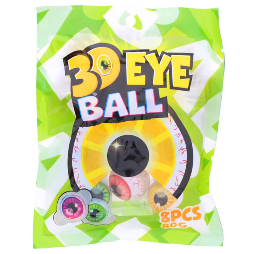 Vaahtokarkki Silmä 80g sisältää 80 gramman pussin vaahtokarkkeja, kahdeksan moniväristä silmää, joissa on täyte ja maut mansikka, sitruuna, omena ja mustikka.