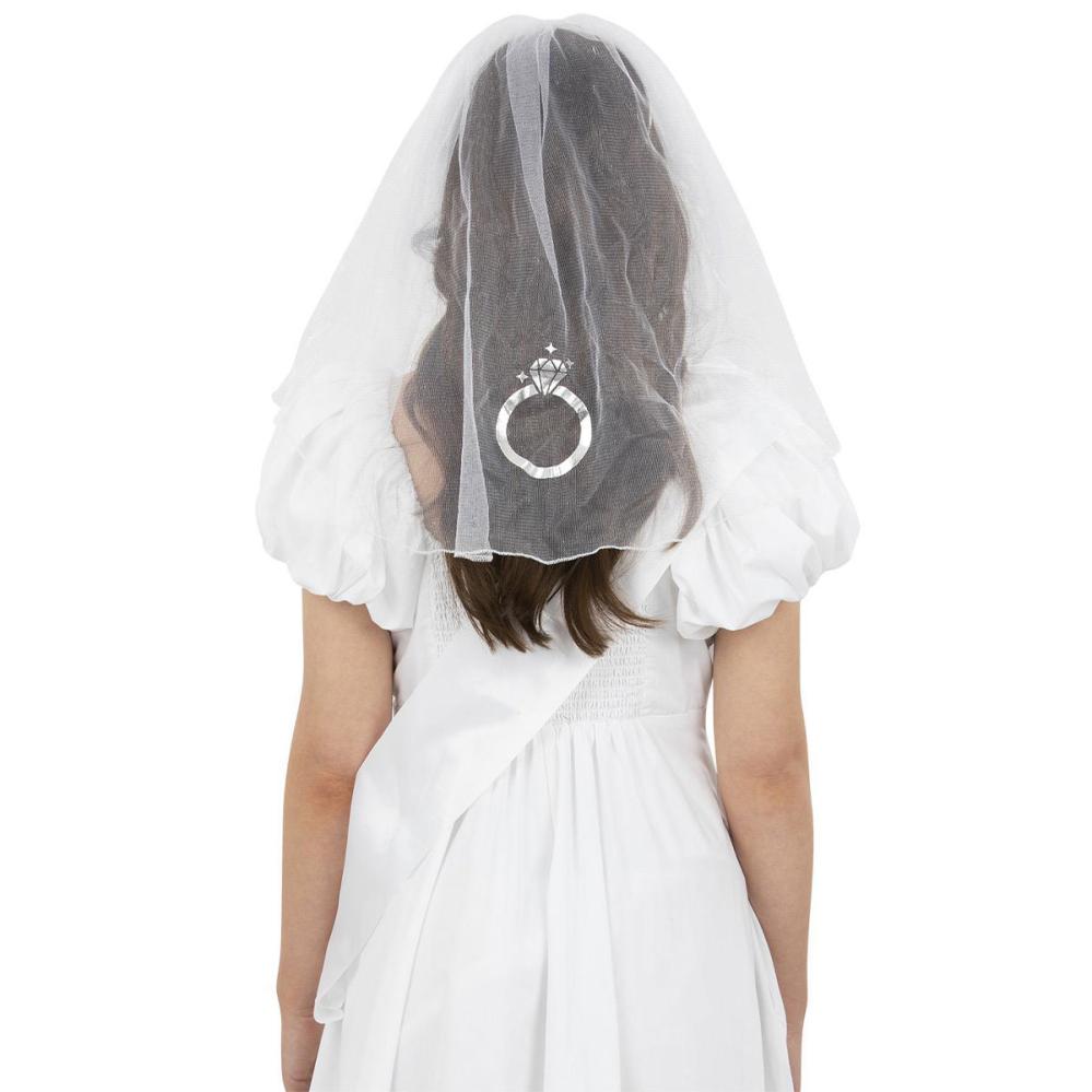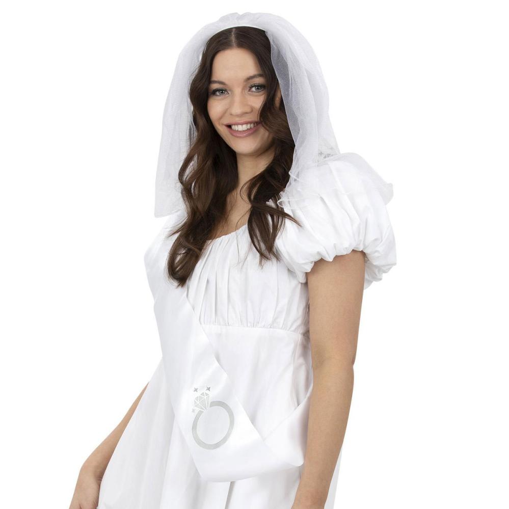 Tee vaikutus juhlissa tällä polttareihin tarkoitetulla morsiusdiadeemilla ja olkanauhalla, jotka ovat täydelliset asusteet morsiusasuun. Valkoinen huntu ja timanttisormuskuvioitu olkanauha ovat täydelliset asusteet, joita jokainen polttariporukka tarvitsee unohtumatonta iltaa varten.