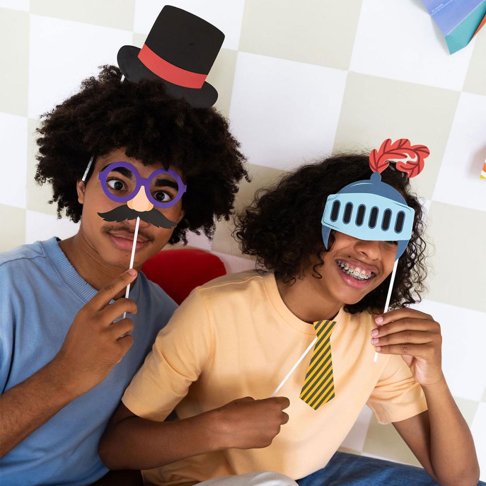 Valokuvausrekvisiitta Naamiaisiin 12 kpl sisältää kaksitoista kuvausrekvisiittaa, joissa on erilaisia naamiaisaiheita, aina ritarinkypärästä ja merirosvohatusta kuninkaan kruunuun ja viiksiin.