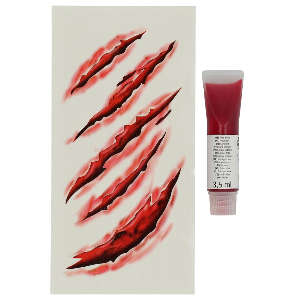 Veri- ja haavatatuoinnit Pakkaukset sisältää setin, jossa on viisi kappaletta väliaikaisia naarmuhaava-tatuointeja ja tuubi, jossa on 3,5 ml punaista feikkiverta.