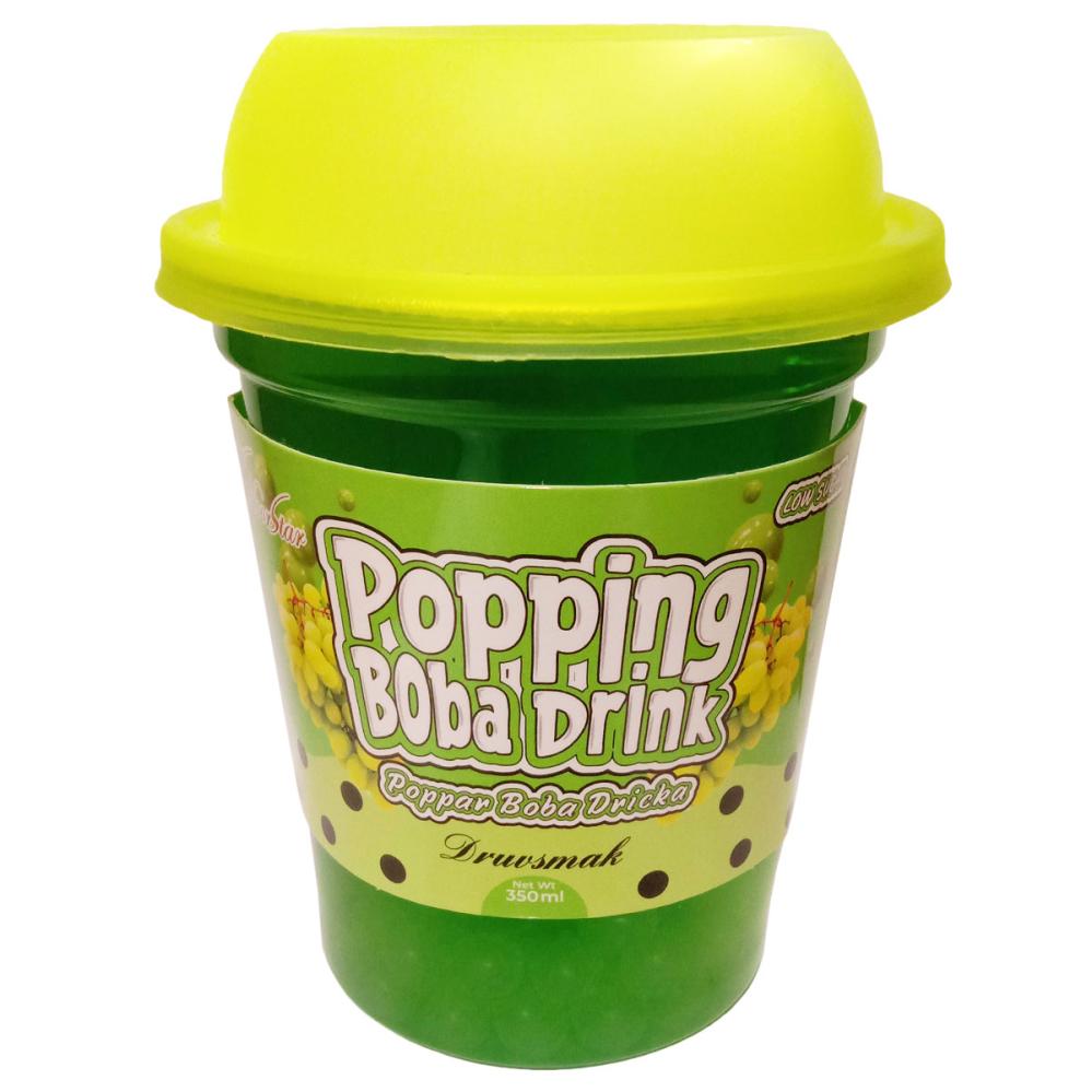 Viinirypälejuoma Popping Boba 350 ml on viinirypälejuoma, jossa on popping boba -palloja 350 ml muovimukissa, mukana paperipilli.