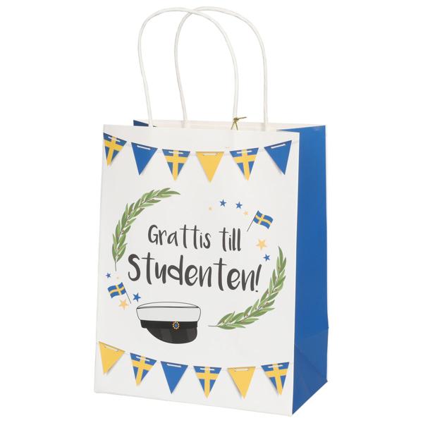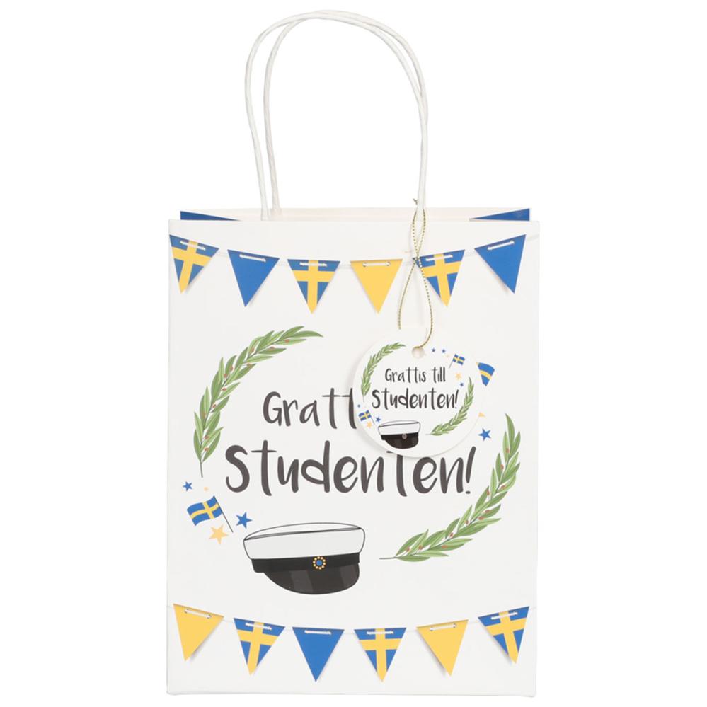 Viirinauha-aiheinen Ylioppilas Lahjakassi 18 x 10 x 23 cm on valkoinen lahjakassi, jossa on mustalla teksti ”Onnea ylioppilaalle!”, ja sitä ympäröivät kaksi vihreää laakerinoksaa, Ruotsin liput, tähdet, ylioppilaslakki sekä kaksi sinikeltaista viirinauhaa ylhäällä ja alhaalla. Kassissa on siniset sivut, valkoiset kantokahvat ja valkoinen pyöreä etiketti, jossa on yhteensopiva kuvio sekä kullanvärinen naru.