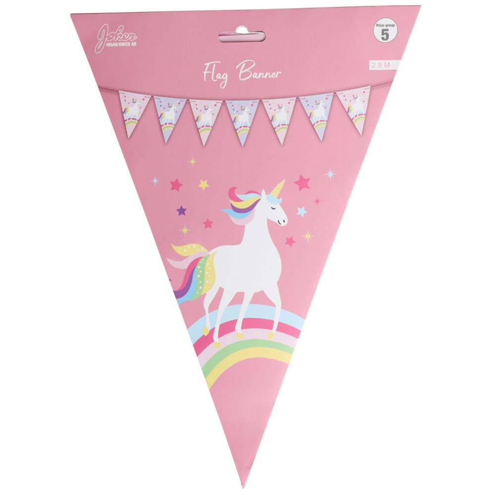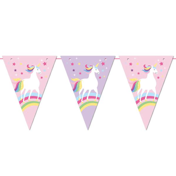 Viirinauha Yksisarvinen sisältää viirinauhan, jossa viirit on koristeltu valkoisella yksisarvisella, sateenkaarella ja monivärisillä tähdillä vaaleanpunaisella tai violetilla taustalla. Nauha roikkuu vaaleanpunaisessa nauhassa.