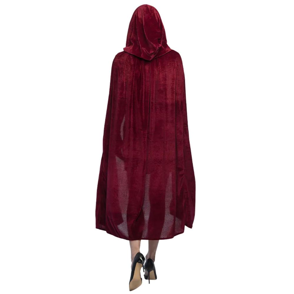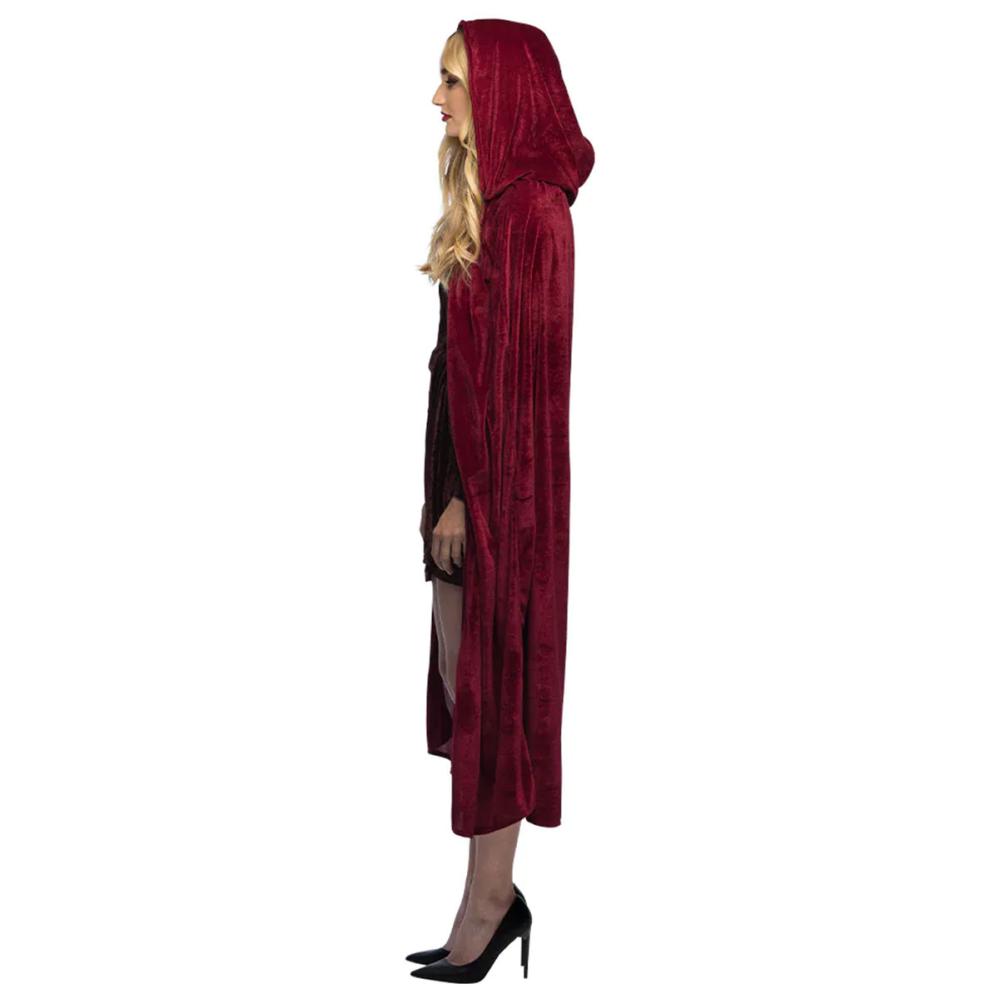Viitta Hupulla Bordeaux on 170 cm pitkä bordeaux'n värinen viitta hupulla, samettimaisesta materiaalista.