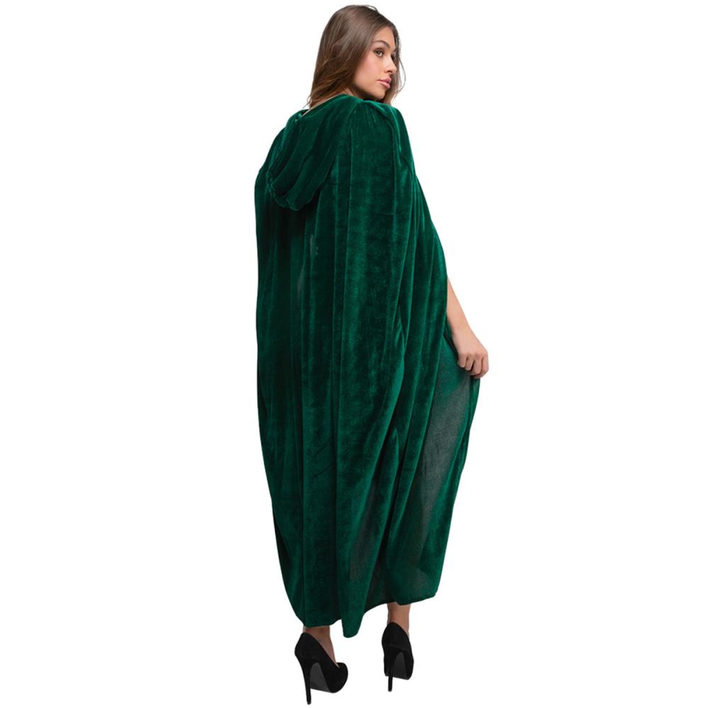 Viitta Hupulla Tummanvihreä on pitkä, tummanvihreä viitta pehmeästä samettimaisesta materiaalista, jossa on huppu ja vihreä solmittava nauha.