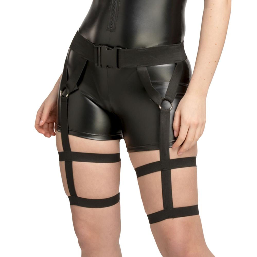 Vyö Reisihihnoilla Musta sisältää mustan naamiaisvyön, jossa on useita remmejä, elastiset tarranauhat ja koristeelliset O-rengasyksityiskohdat. Vyö kiinnitetään vyötärölle suurella soljella.