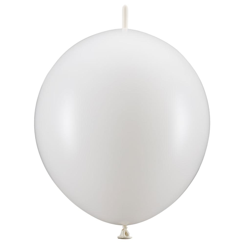 Yhdistettävät Ilmapallot Metallinen Valkoinen 20-kpl sisältää kaksikymmentä yhdistettävää lateksipalloa metallinhohtoisessa valkoisessa sävyssä, jotka yhdistetään toisiinsa koristeeksi.