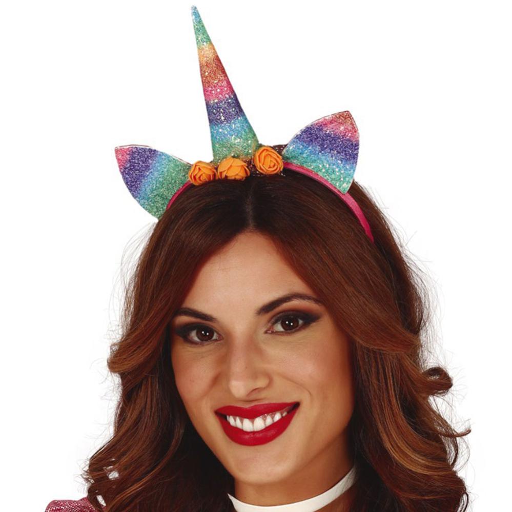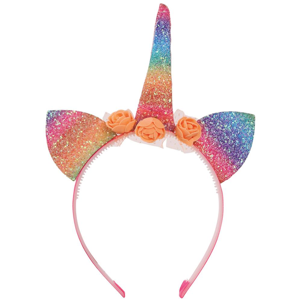Yksisarvisen Diadeemi Kukilla sisältää vaaleanpunaisen diadeemin, jossa on yksisarvisen sarvi ja korvat sateenkaaren väreissä sekä kolme keinokukkaa vaalean persikan sävyssä.