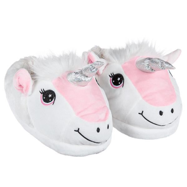 Unicorn Slippers sisältää valkoiset yksisarvistossut, joissa on ulkonevat yksisarvisen sarvet ja korvat, pörröinen harja ja iloiset kasvot.