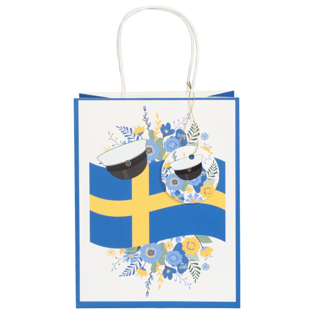 Ylioppilas Lahjakassi Ruotsin Lippu 18 x 10 x 23 cm on valkoinen lahjakassi, jossa on Ruotsin lippu, kukkia, klassinen ylioppilaslakki ja sininen reunus ympäriinsä. Kassissa on siniset sivut, valkoiset kantokahvat ja valkoinen pyöreä etiketti, jossa on kukkia ja ylioppilaslakki, jossa on kullanvärinen nauha.